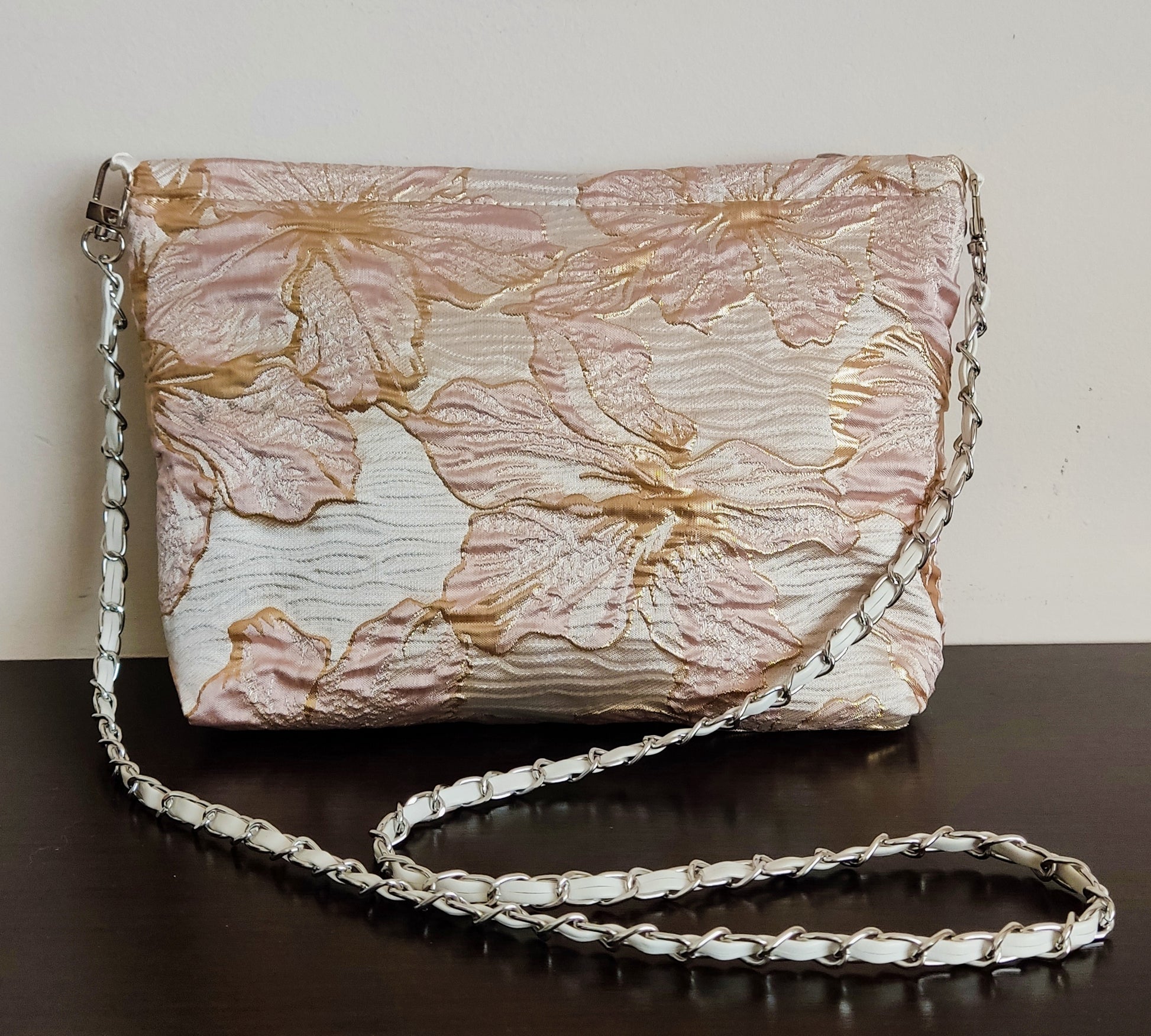 ΤΣΑΝΤΑΚΙ ΜΕ ΑΛΥΣΙΔΑ& ΔΕΡΜΑΤΙΝΗ ΚΑΙ ΚΛΕΙΣΙΜΟ ΜΕ ΦΕΡΜΟΥΑΡ ΑΠΟ ΥΦΑΣΜΑ ΤΥΠΟΥ ΣΑΤΕΝ ΜΕ ΑΝΑΓΛΥΦΟ ΣΧΕΔΙΟ.ΦΟΔΡΑΡΙΣΜΕΝΟ ΣΕ ΧΡΩΜΑΤΙΣΜΟΥΣ ΡΟΖ. ΔΙΑΣΤΑΣΕΙΣ 25εκ. ΦΑΡΔΟΣ ΚΑΙ 17εκ. ΥΨΟΣ