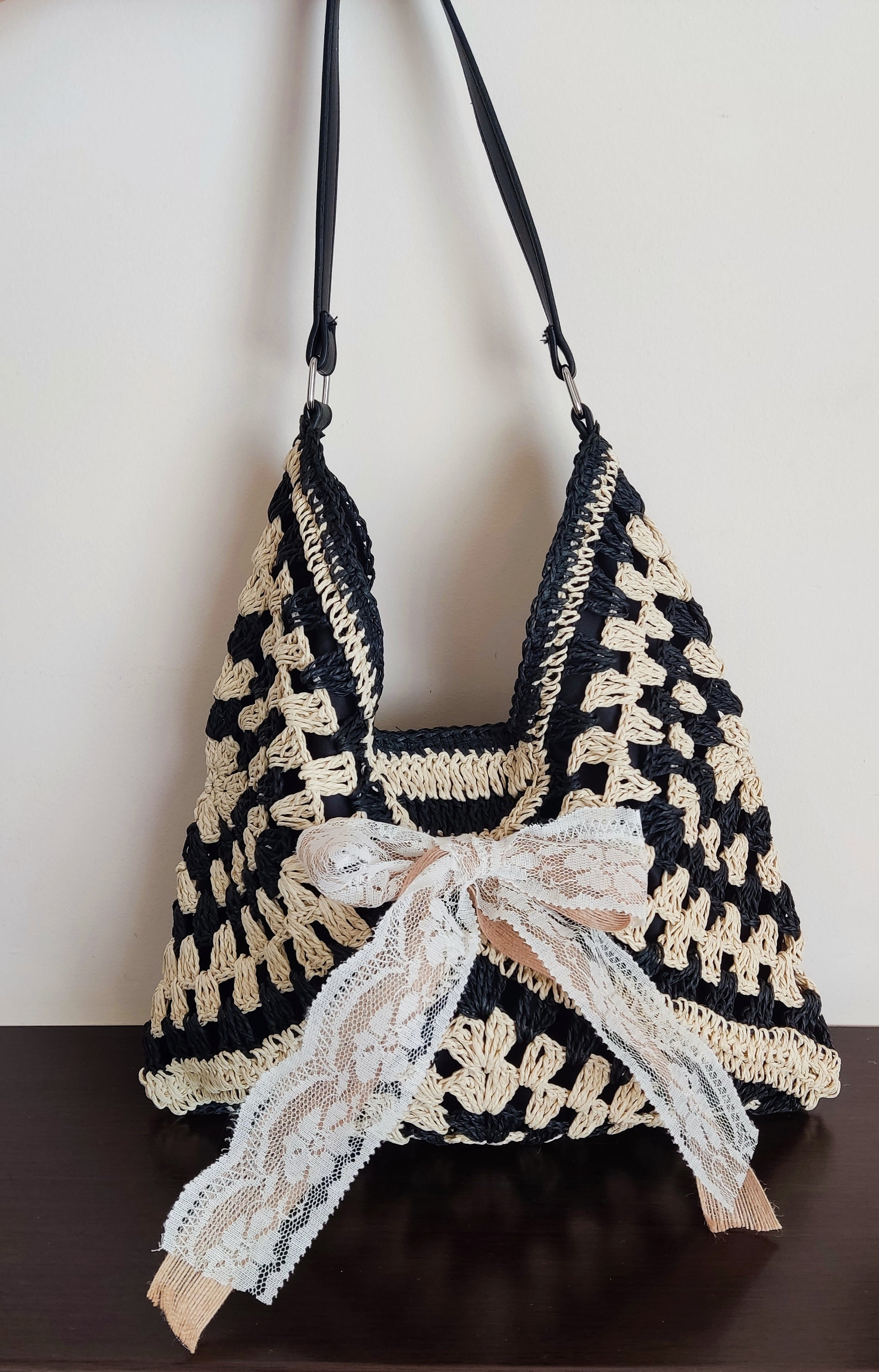 ΨΑΘΙΝΗ ΤΣΑΝΤΑ ΦΟΔΡΑΡΙΣΜΕΝΗ ΣΕ ΜΑΥΡΟ ΧΡΩΜΑ ΜΕ ΕΣΩΤΕΡΙΚΗ ΤΣΕΠΗ ΔΙΑΚΟΣΜΗΜΕΝΗ ΜΕ ΦΙΟΓΚΟ ΔΑΝΤΕΛΑΣ ΚΑΙ ΛΙΝΑΤΣΑΣ. ΚΛΕΙΣΙΜΟ ΜΕ ΚΟΥΜΠΙ. ΟΙ ΔΙΑΣΤΑΣΕΙΣ ΕΙΝΑΙ 45εκ ΦΑΡΔΟΣ ΚΑΙ 35εκ.ΥΨΟΣ.